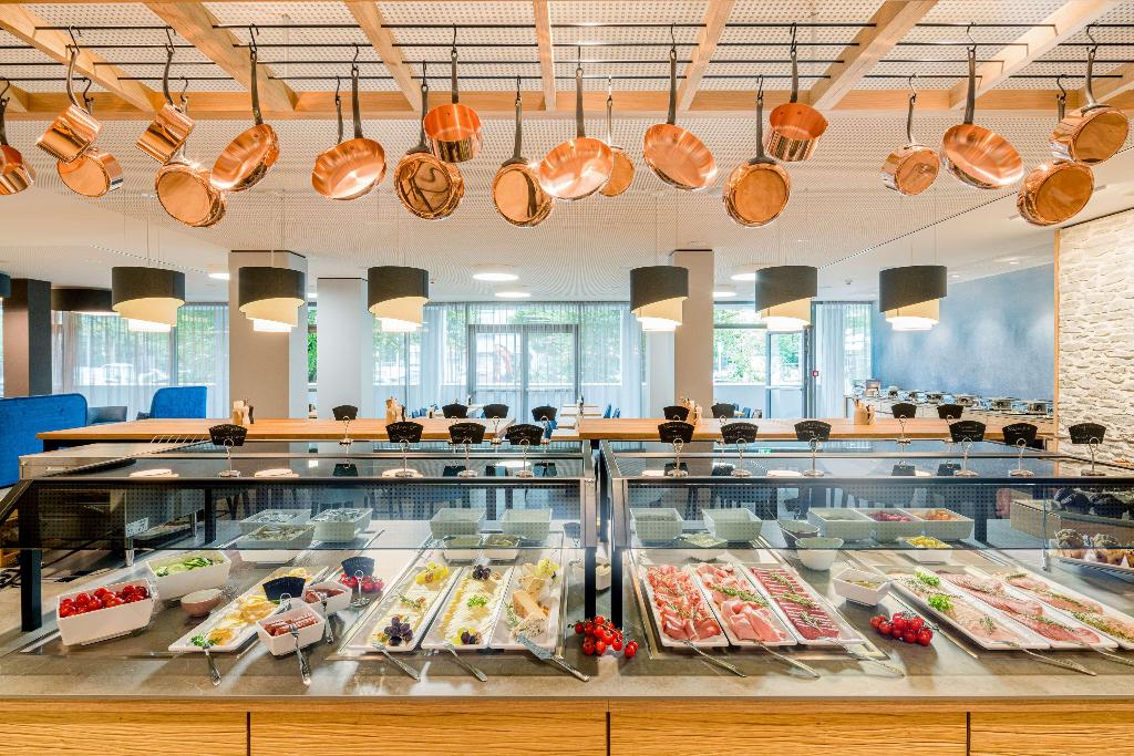 Der gastronomische Bereich umfasst ein Restaurant und eine Bar. Frühstück und Mittagessen sorgen täglich für kulinarische Genüsse. Auch besondere Speisen sind erhältlich, darunter Diätgerichte. Darüber hinaus stellt das Haus spezielle Verpflegungsangebote bereit.