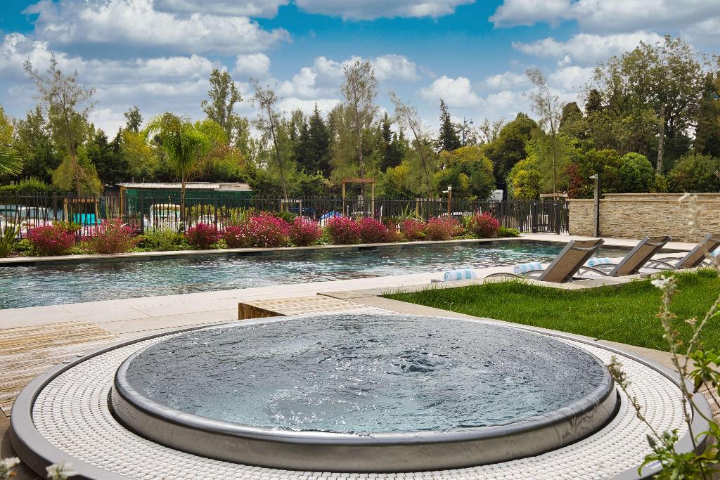 Angenehm beheiztes Wasser im Außenpoolbereich sorgt für ein gesundes Badeerlebnis. Auf der Sonnenterrasse sind Liegestühle und Schirme vorhanden. Wohlige Entspannung verspricht der Whirlpool im Badebereich. Abwechslung bieten verschiedene Angebote, darunter Radfahren/Mountainbiking, Tennis, ein Spa, eine Sauna und Wandern.
